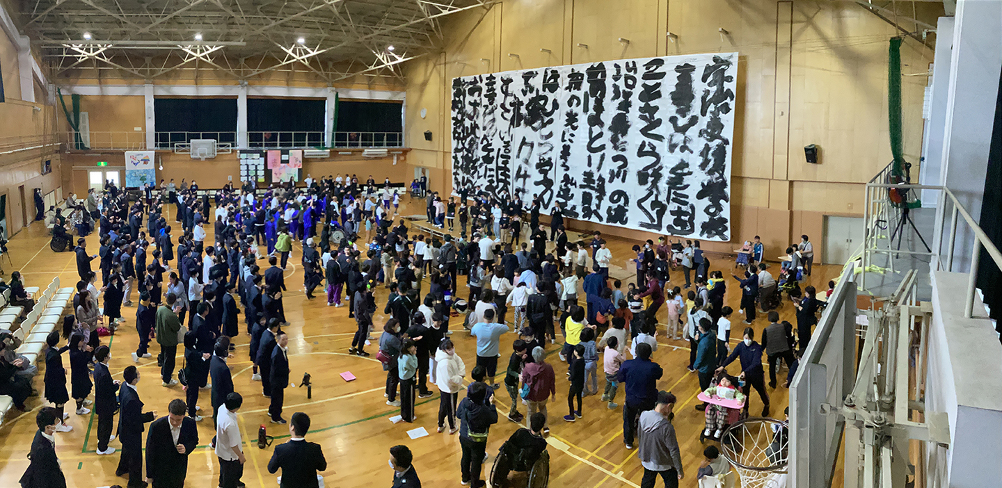 This project sends artists to schools in Kyoto Prefecture that wish to participate. In 2025, we visited Uji Shien School for the first time in over 10 years. They expressed themselves with brush and ink, and worked together to write a giant school song. They got their hands and feet dirty black, but the giant school song was completed. Apparently, the school song was sung in front of this at the school festival.