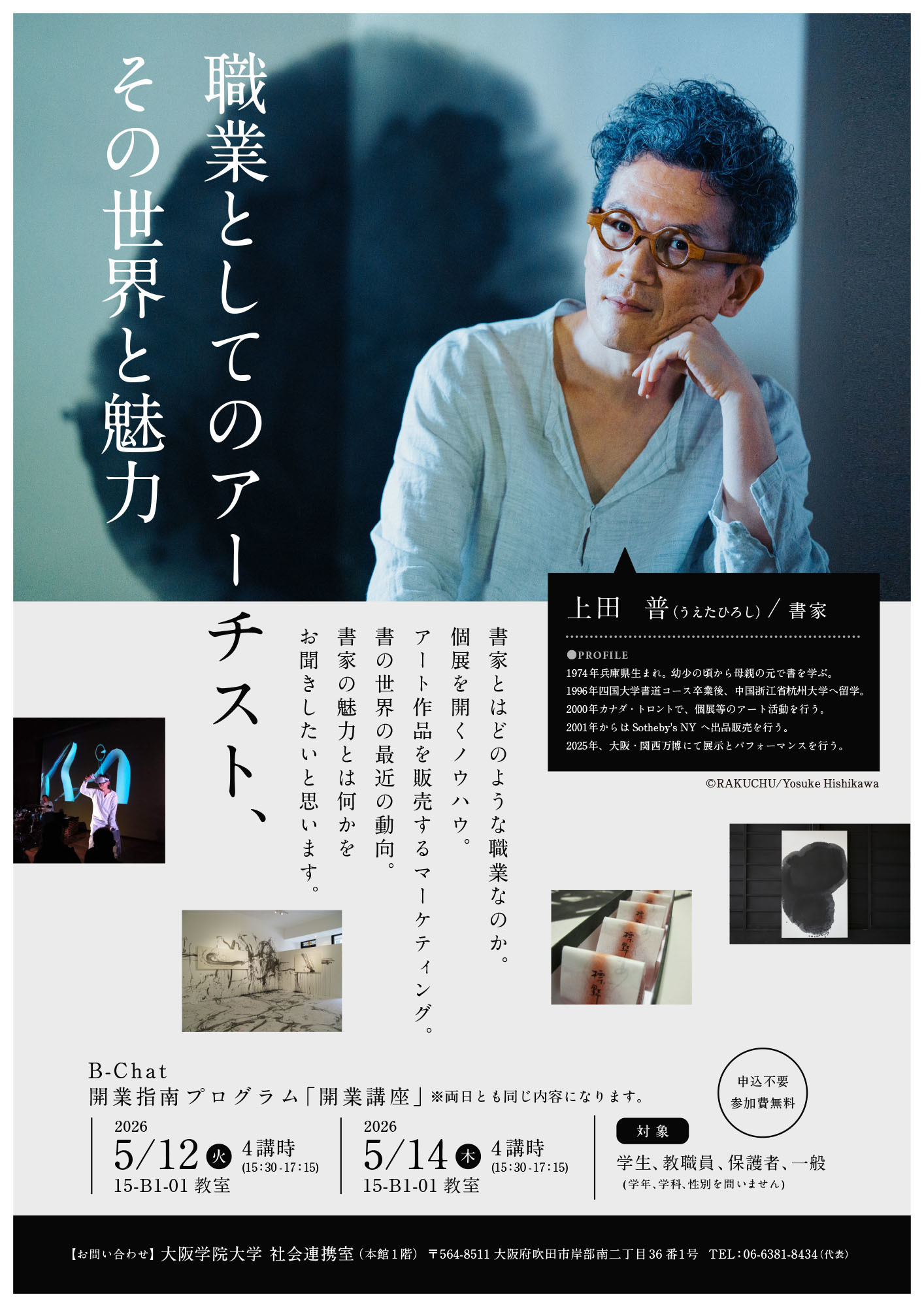 書家とはどのような職業なのか。個展を開くノウハウ。アート作品を販売するマーケティング。書の世界の最近の動向。書家の魅力とは何かを質疑応答形式でお話させて頂きます。